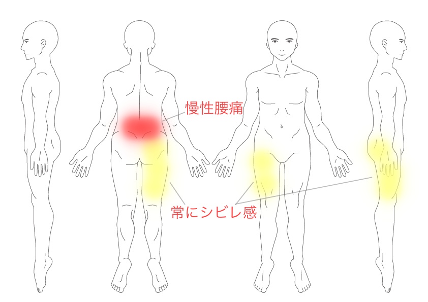 4〜5年程前から腰痛に悩まされており、マッサージや整骨院に通院していた。ある時から右側のお尻〜太ももにかけてシビレが出はじめた。整体を受けるも改善されず「鍼灸なら」と思い立ち、インターネットで当院を知り来院。