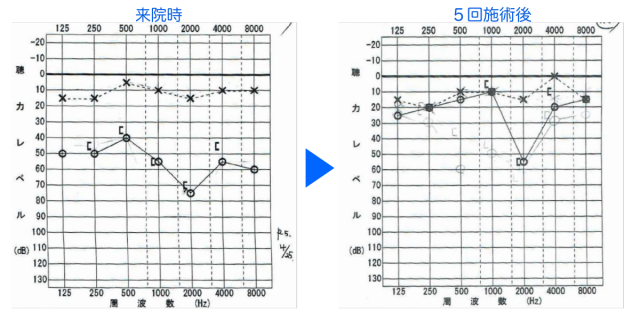 施術を重ねる度に耳鳴りに変化があった。これは聴力がゆっくりと回復していることで起こっていると考えた。 発症から5日の比較的早いタイミングで鍼施術を始められたことで、順調に回復に向かった。